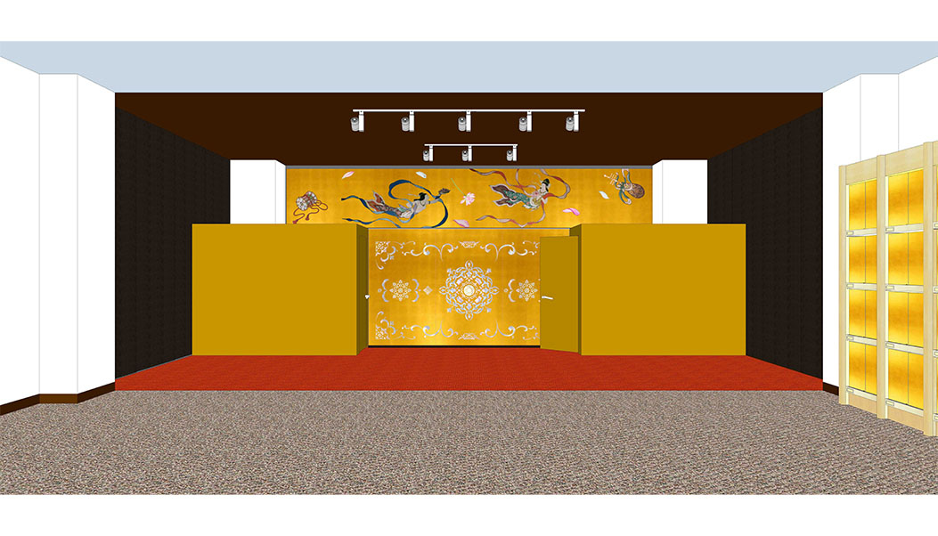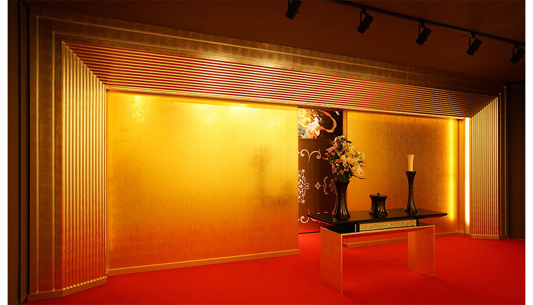江別市 真法寺大麻支院 様(浄土真宗本願寺派)永代・合葬納骨所 幅 6700㎜×奥行(赤いカーペット部分)4700㎜永代・合葬者を約2000体納骨することができます中央の本尊様前の扉を開くと奥に合葬室があります納骨された方のお名前は2.5㎝×10㎝の金箔柄板に1860名様のお名前を簡単に設置することができます 前のページに戻る